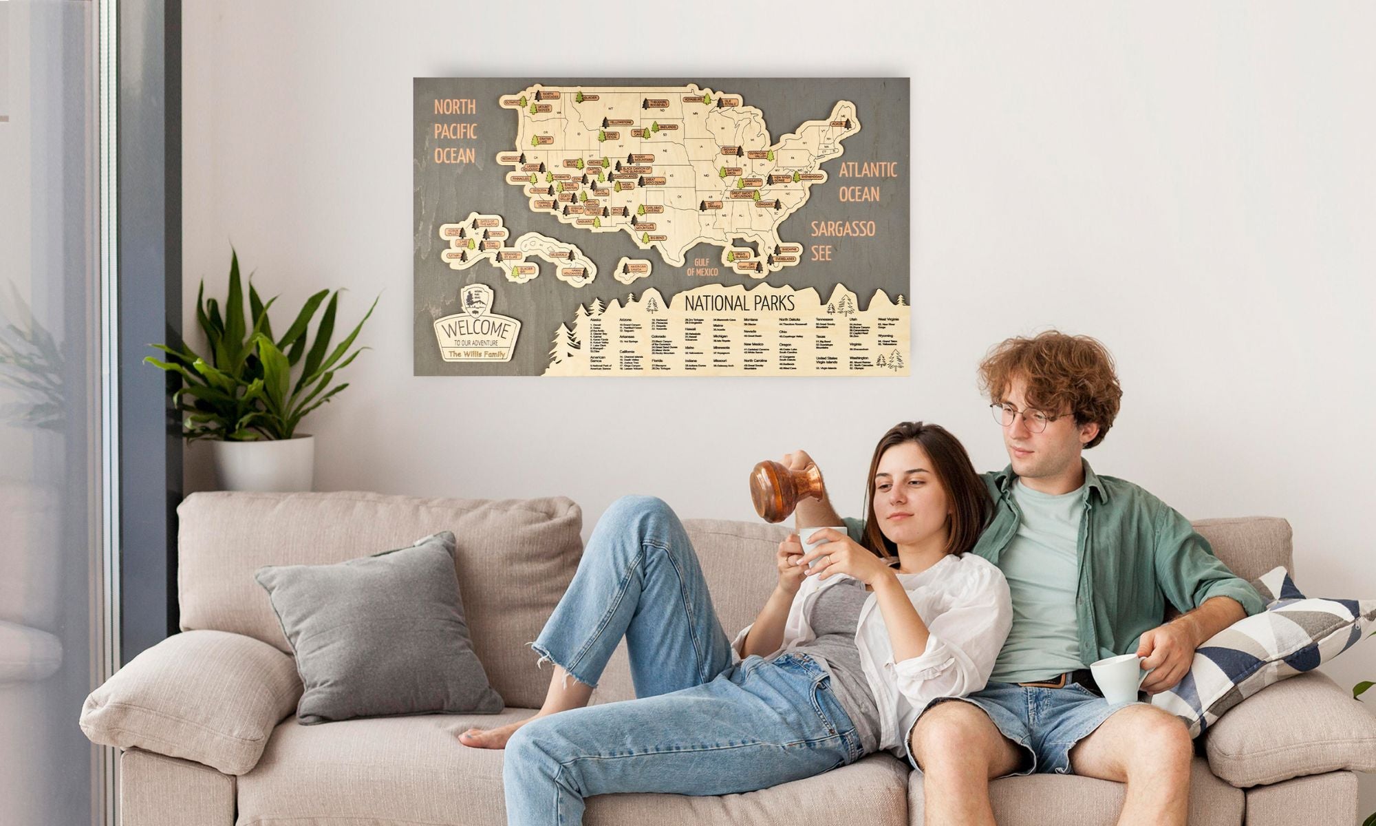 In recent years, wall decor in the form of wooden national parks travel map has taken an essential place in the design and decoration of the interior of a house, apartments, offices, schools, travel agencies, restaurants, or other themed establishments. Personalized maps of US national parks on the wall made of high-quality and natural wood are fashionable, educational, and original. Compared with others, they are quite advantageous in price since they are the lowest priced of all types of maps. Such decor is usually made in one color, although we also have exclusive models with different colors. Therefore, feel free to choose the color, size, type of engraving, and decor for the map itself and get a high-quality and beautiful wall – and most importantly, eco-friendly decor made of real wood.
