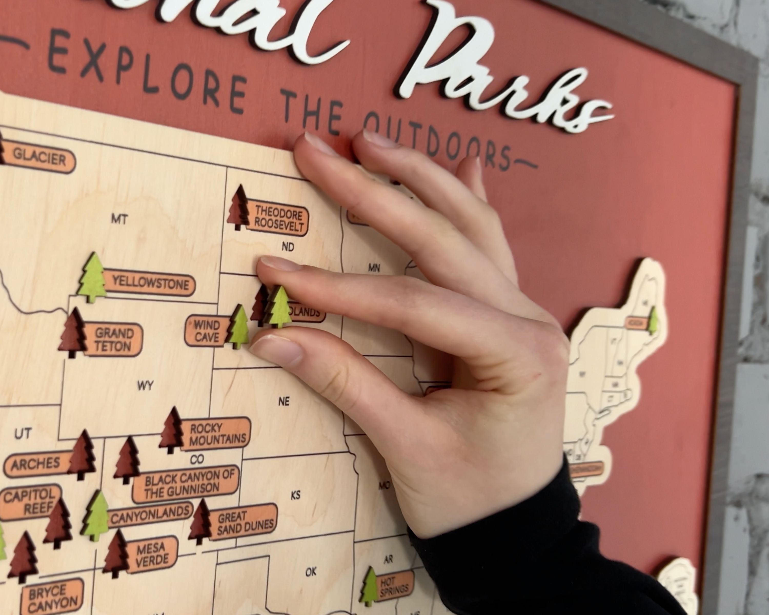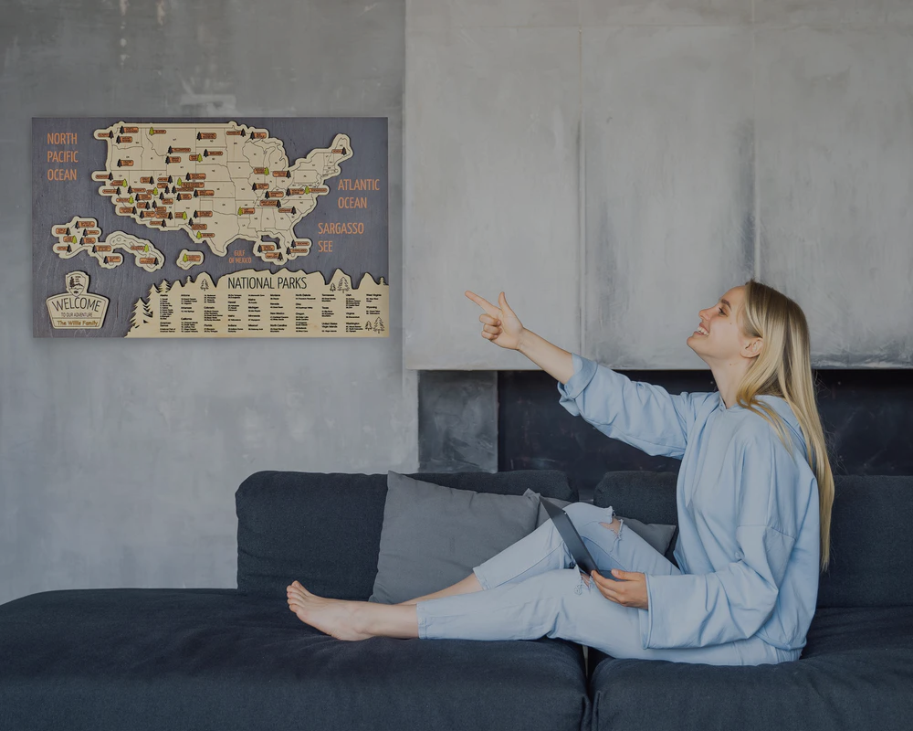In recent years, wall decor in the form of wooden national parks travel map has taken an essential place in the design and decoration of the interior of a house, apartments, offices, schools, travel agencies, restaurants, or other themed establishments. Personalized maps of US national parks on the wall made of high-quality and natural wood are fashionable, educational, and original. Compared with others, they are quite advantageous in price since they are the lowest priced of all types of maps. Such decor is usually made in one color, although we also have exclusive models with different colors. Therefore, feel free to choose the color, size, type of engraving, and decor for the map itself and get a high-quality and beautiful wall – and most importantly, eco-friendly decor made of real wood.