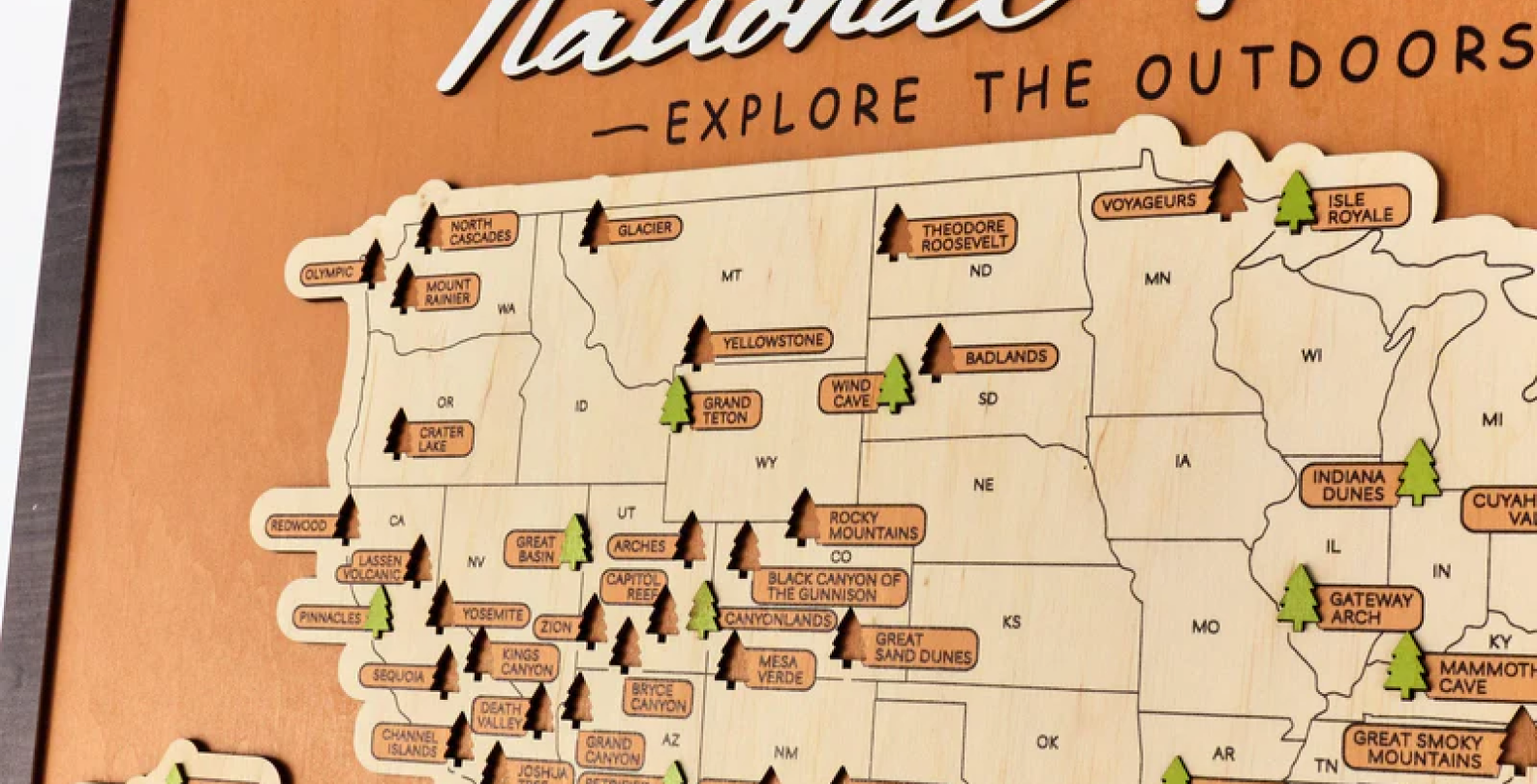 US Wooden National Parks Travel Map With Trees To Record Park Visits (Light Walnut)