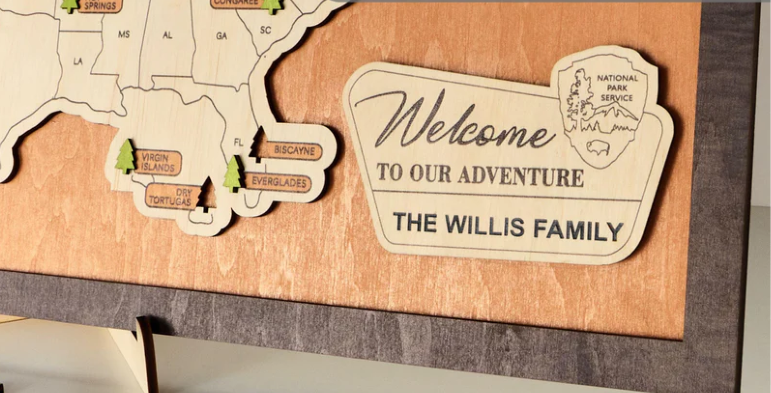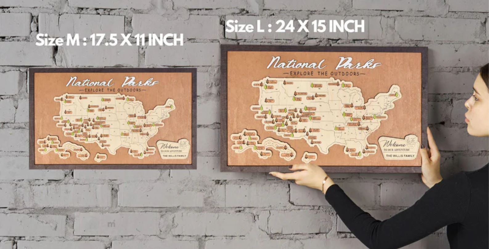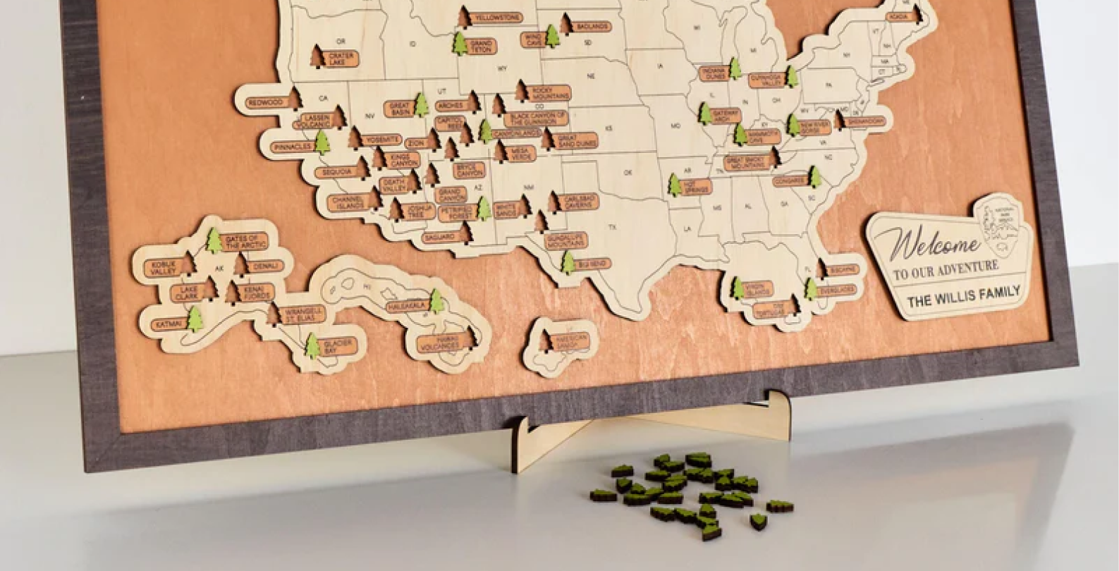 This National Park Travel Map can be used to record the parks you have visited - each park has a corresponding cutout green tree that you can place on the map once you've visited the park. They are crafted from durable Baltic birch plywood and come in a variety of colors. Each map comes with a decorative display stand. They are also commonly hung on the wall with 3M strips, if you would prefer not to install the sawtooth hanger.