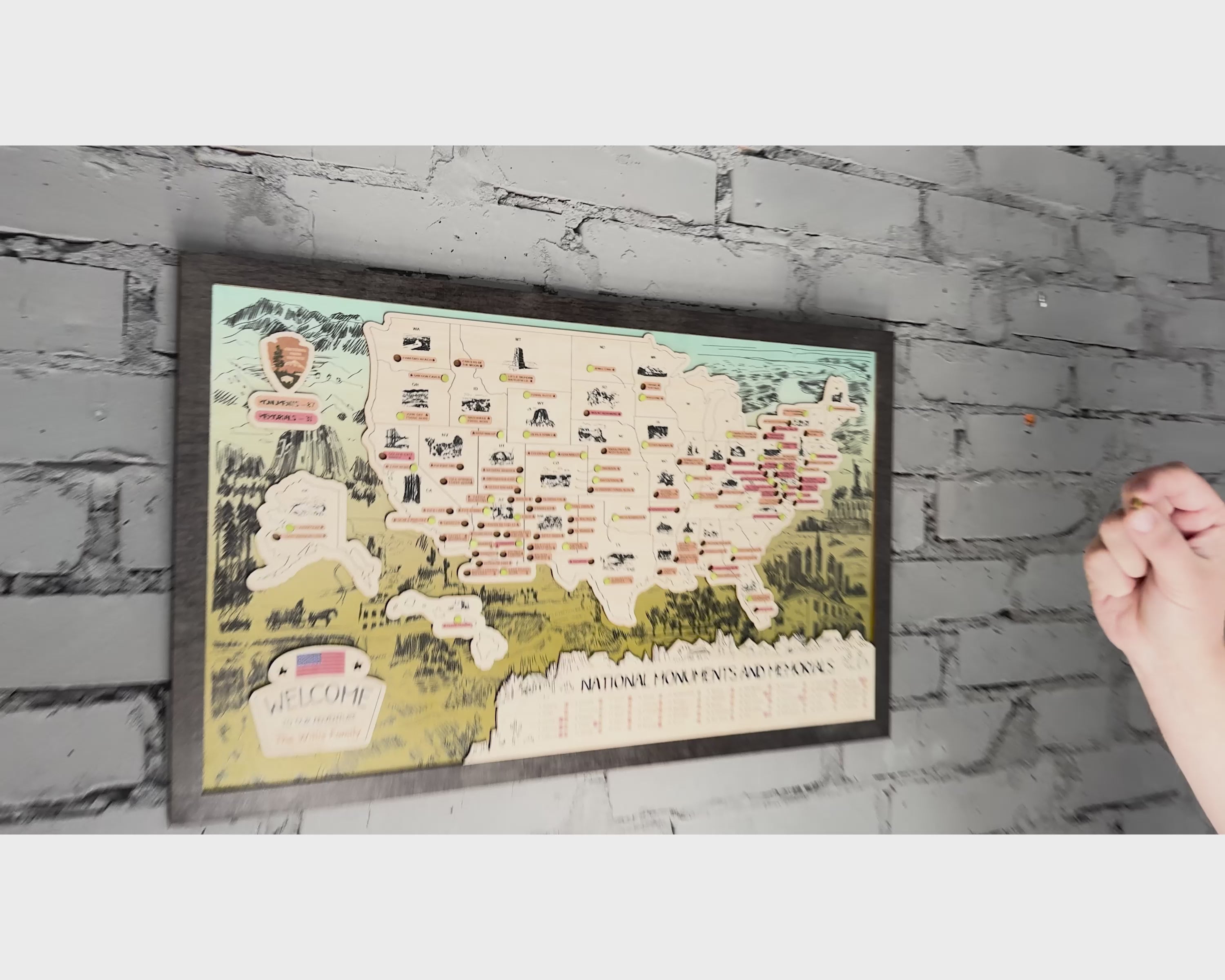 US Wooden National Monuments & Memorials Travel Map With Pins To Record Visits (Green Design)