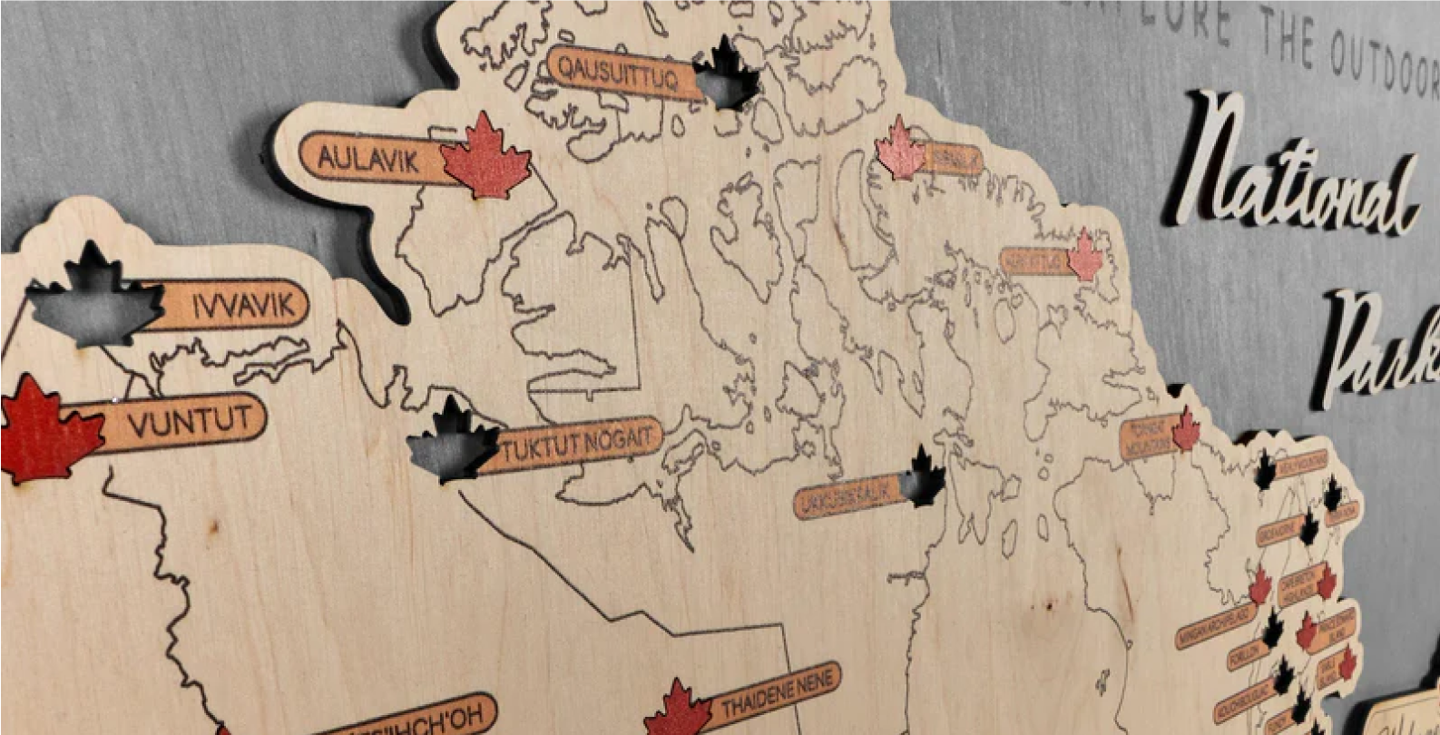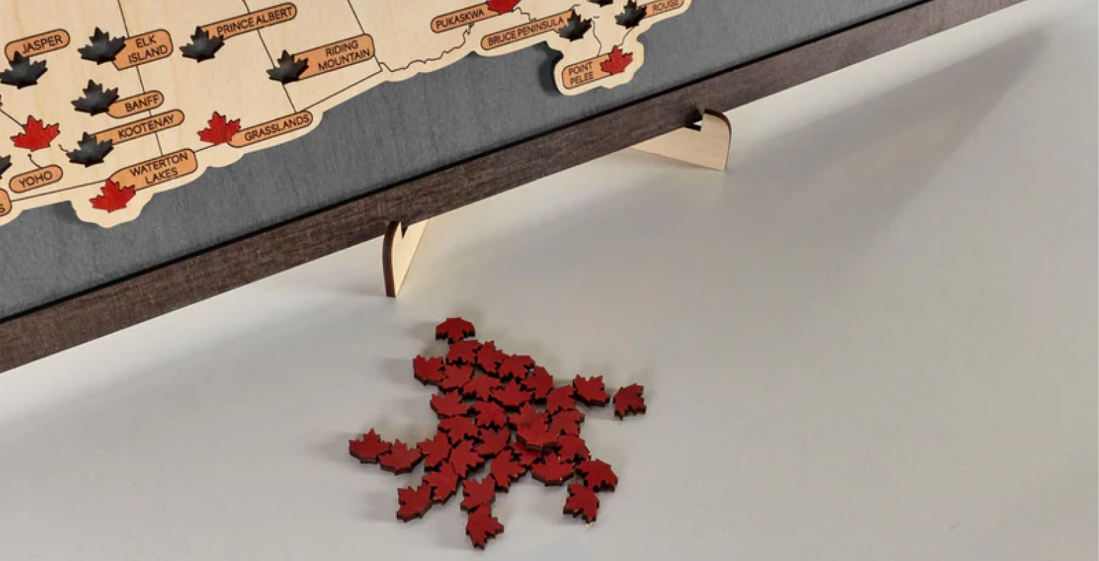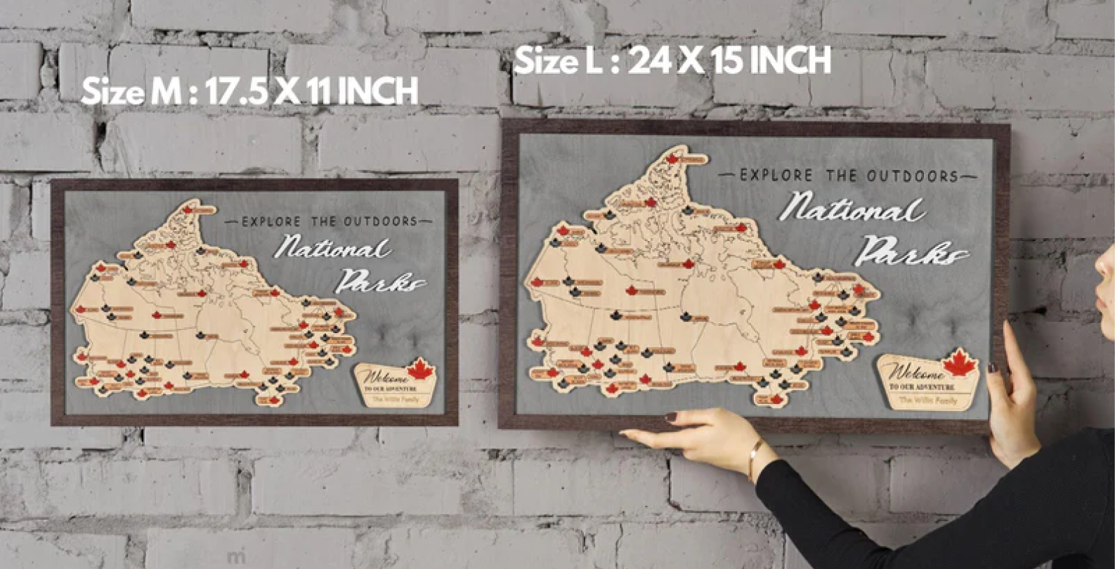 This Canada National Park Travel Map can be used to record the parks you have visited - each park has a corresponding cutout maple that you can place on the map once you've visited the park. They are crafted from durable Baltic birch plywood and come in a variety of colors. Each map comes with a decorative display stand. They are also commonly hung on the wall with 3M strips, if you would prefer not to install the sawtooth hanger.