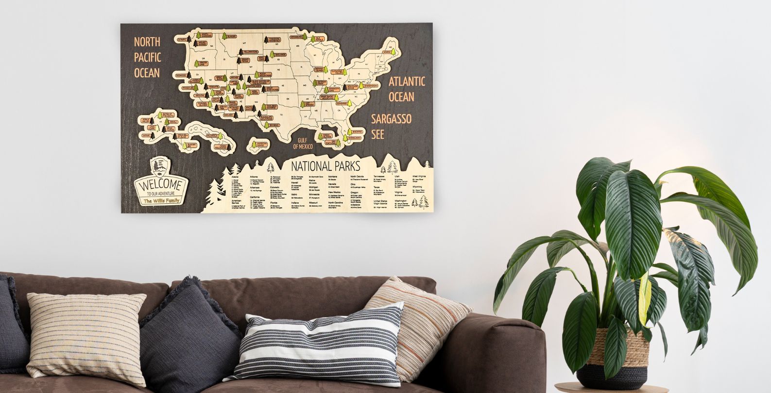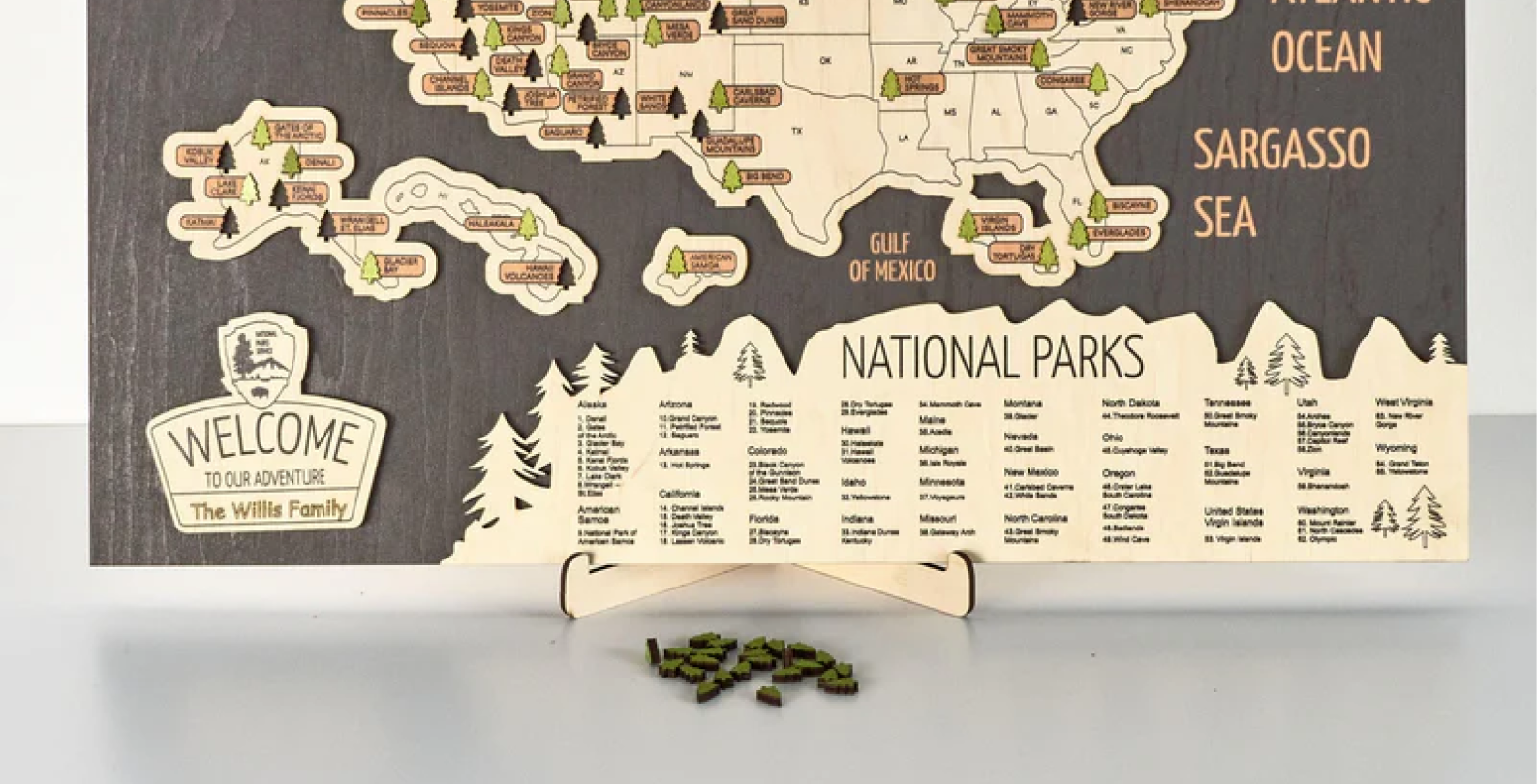 Embark on a journey of discovery with this elegant National Park travel map, crafted from high-quality Baltic birch plywood. Use the vibrant green tree markers to highlight the parks you've explored. Whether you choose to display it on the included stand or mount it on the wall with sawtooth hangers or 3M strips, this map is a perfect centerpiece for any room. Multiple color options make it easy to match your decor and inspire future adventures.