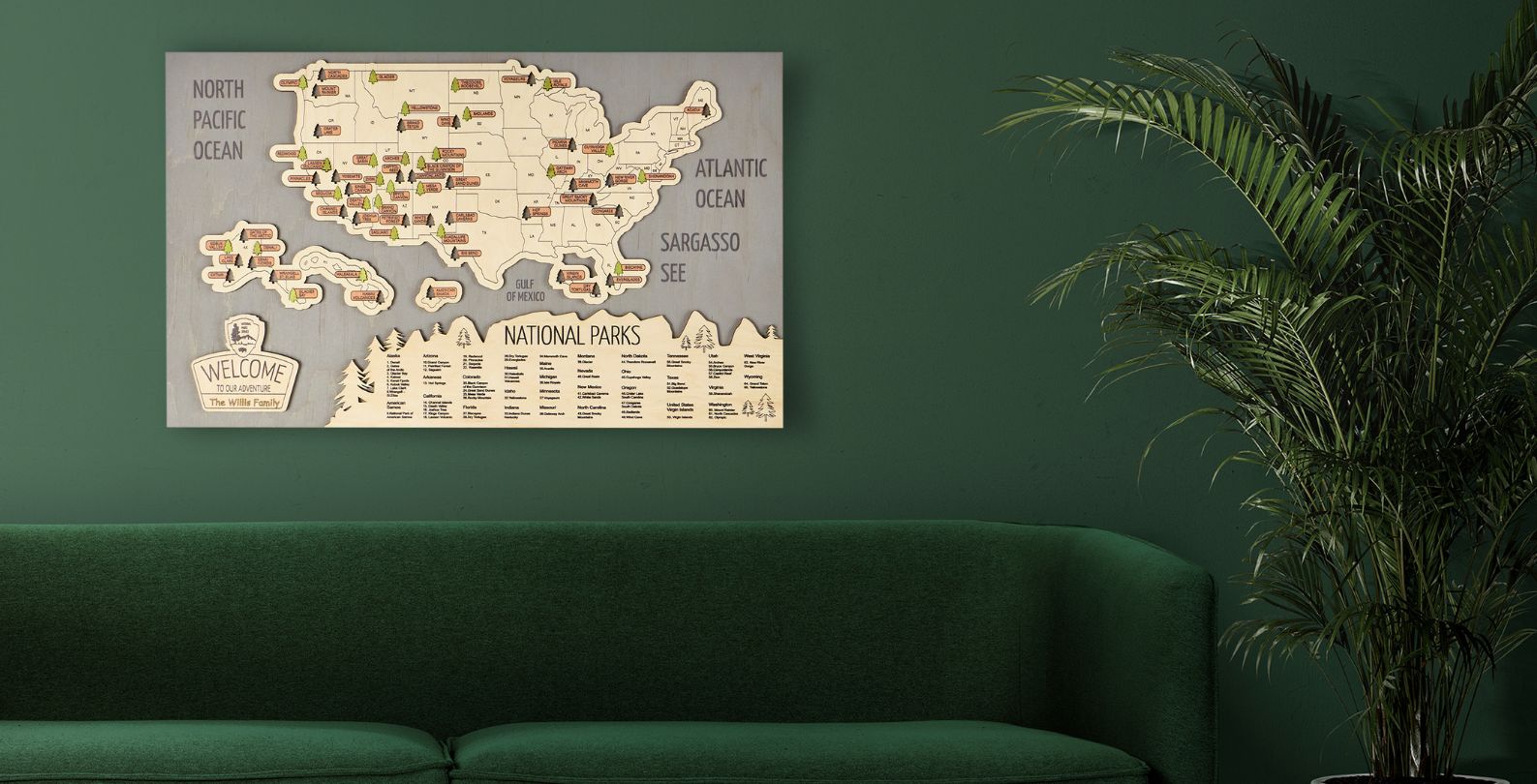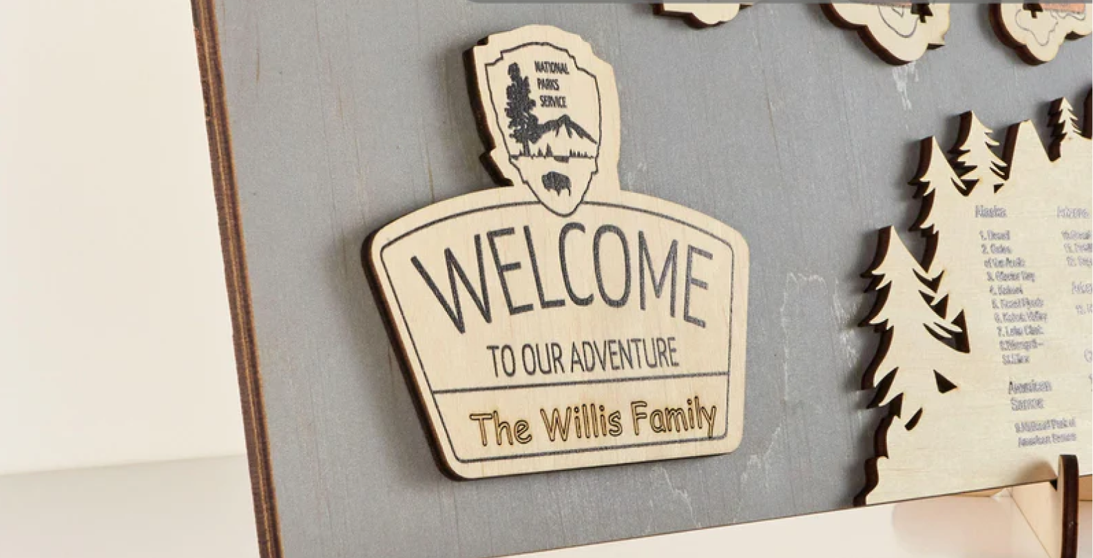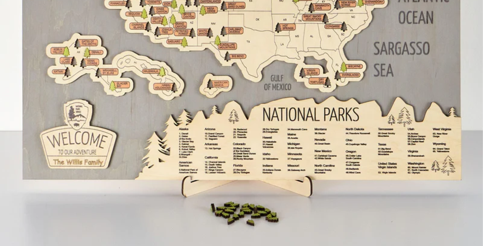 This National Park Travel Map can be used to record the parks you have visited - each park has a corresponding cutout green tree that you can place on the map once you've visited the park. They are crafted from durable Baltic birch plywood and come in a variety of colors. Each map comes with a decorative display stand. They are also commonly hung on the wall with 3M strips, if you would prefer not to install the sawtooth hanger.