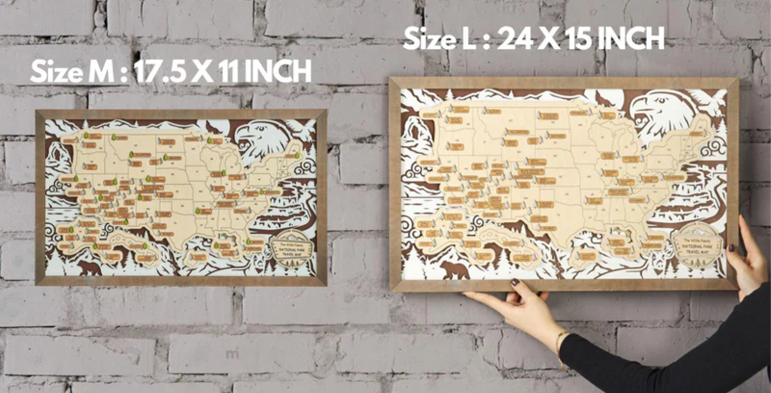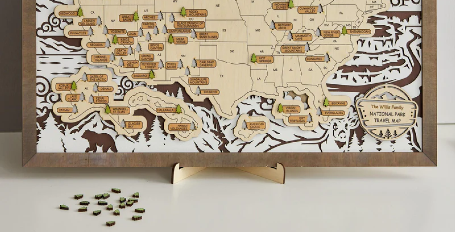 This National Park Travel Map can be used to record the parks you have visited - each park has a corresponding cutout green tree that you can place on the map once you've visited the park. They are crafted from durable Baltic birch plywood and come in a variety of colors. Each map comes with a decorative display stand. They are also commonly hung on the wall with 3M strips, if you would prefer not to install the sawtooth hanger.