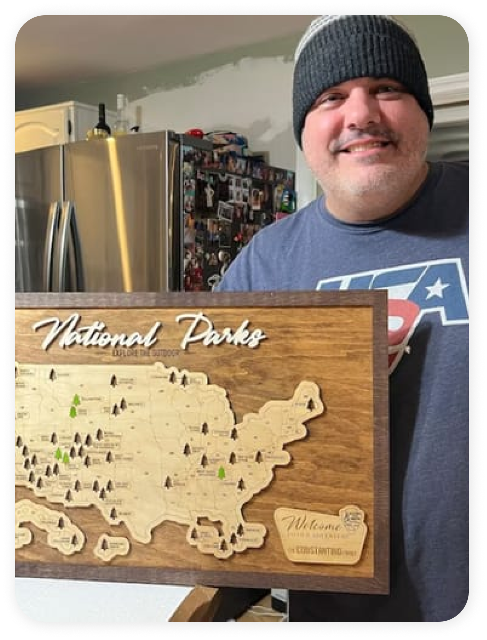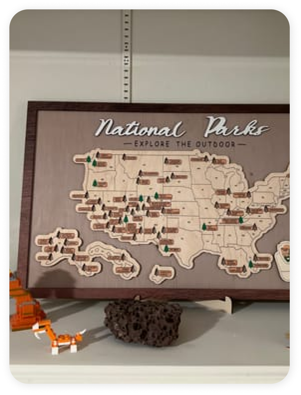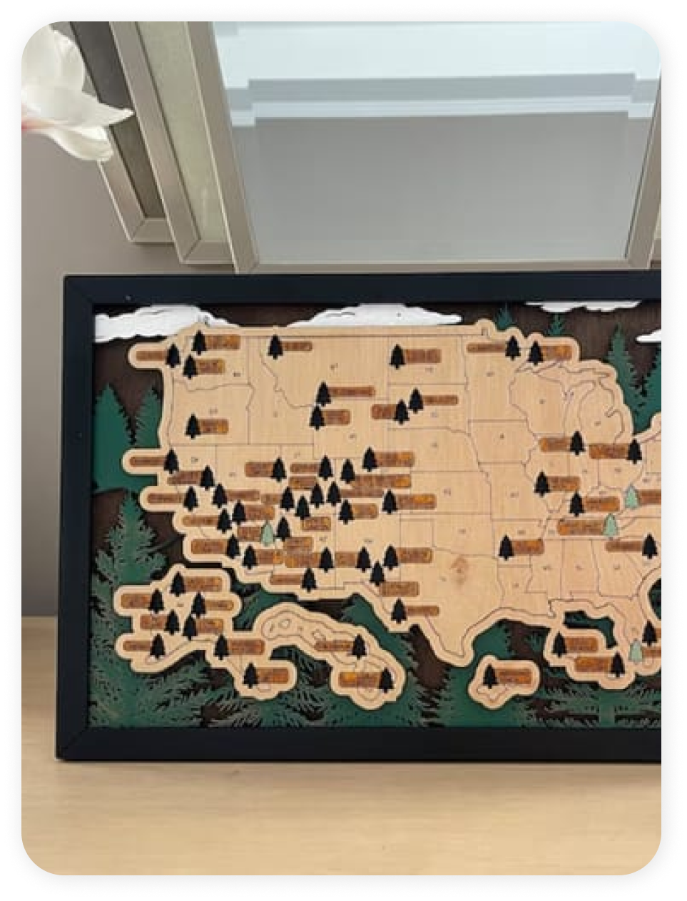 This State Park Travel Map can be used to record the parks you have visited - each park has a corresponding cutout green tree that you can place on the map once you've visited the park. They are crafted from durable Baltic birch plywood and come in a variety of colors. Each map comes with a decorative display stand. They are also commonly hung on the wall with 3M strips, if you would prefer not to install the sawtooth hanger.