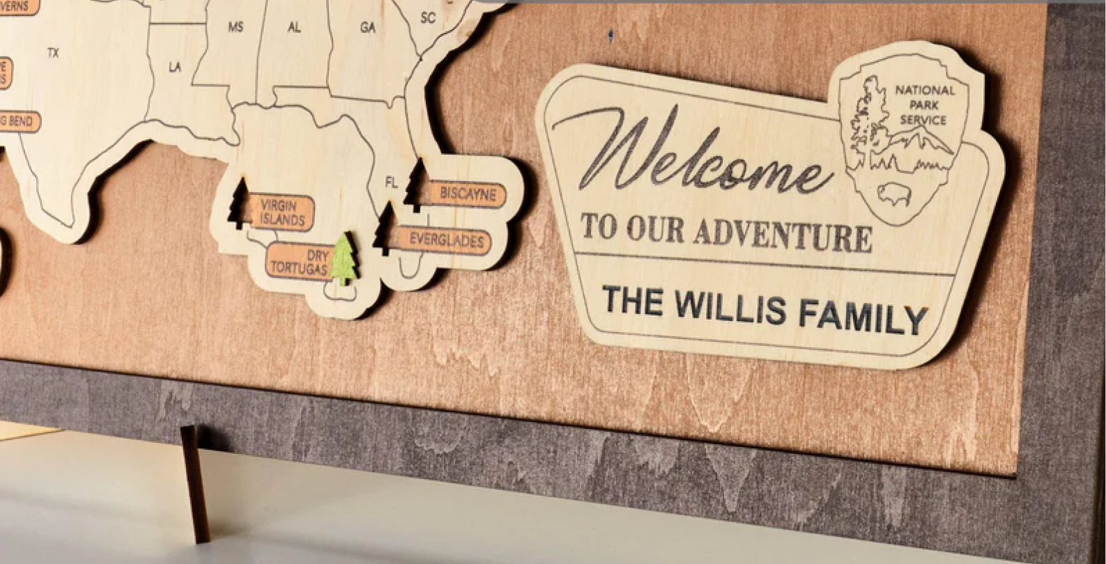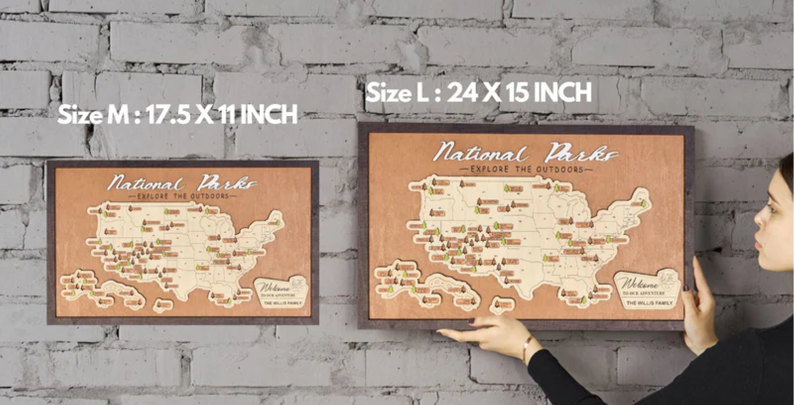 This National Park Travel Map can be used to record the parks you have visited - each park has a corresponding cutout green tree that you can place on the map once you've visited the park. They are crafted from durable Baltic birch plywood and come in a variety of colors. Each map comes with a decorative display stand. They are also commonly hung on the wall with 3M strips, if you would prefer not to install the sawtooth hanger.