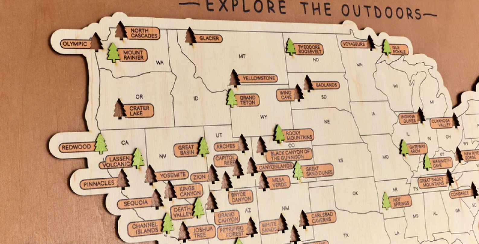 US Wooden National Parks Travel Map With Trees To Record Park Visits (Palisander)