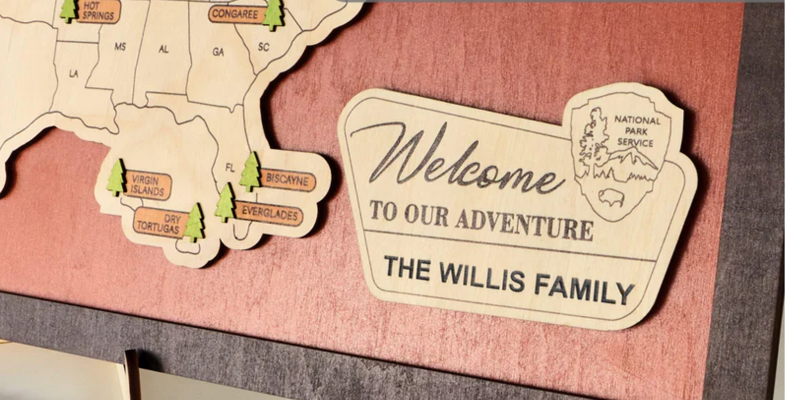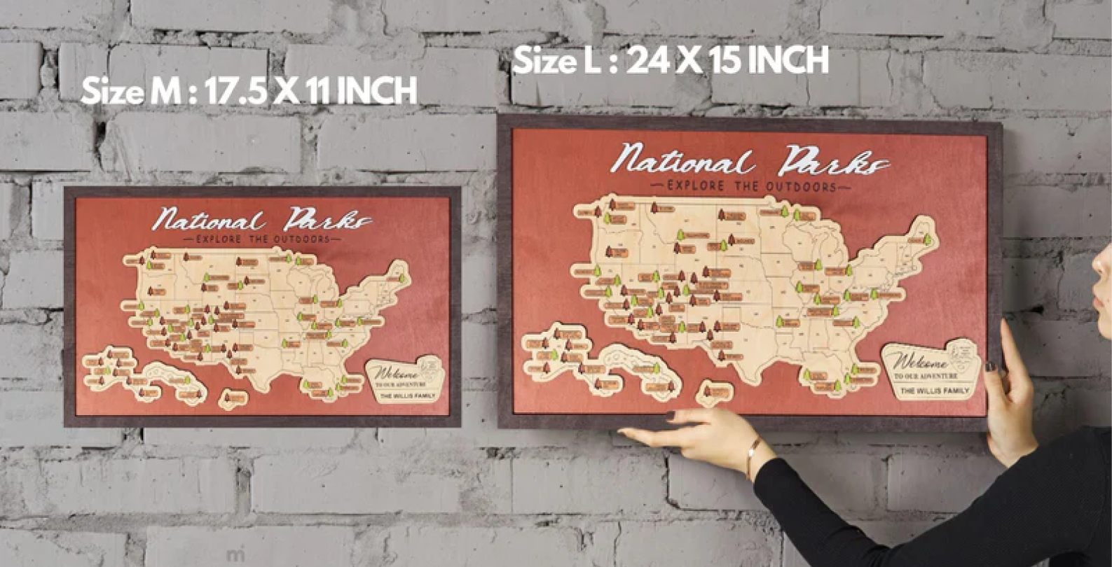 This National Park Travel Map can be used to record the parks you have visited - each park has a corresponding cutout green tree that you can place on the map once you've visited the park. They are crafted from durable Baltic birch plywood and come in a variety of colors. Each map comes with a decorative display stand. They are also commonly hung on the wall with 3M strips, if you would prefer not to install the sawtooth hanger.