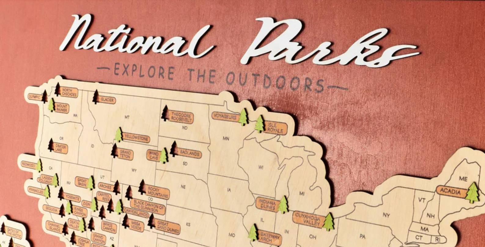 US Wooden National Parks Travel Map With Trees To Record Park Visits (Red)